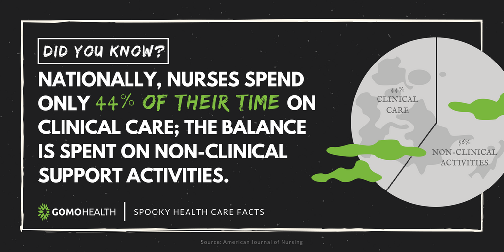 Nationally, nurses spend only 44% of their time on clinical care; the balance is spent on non-clinical support activities. (source: American Journal of Nursing) Learn how nurses can free up their time to work on more clinical work by clicking here.